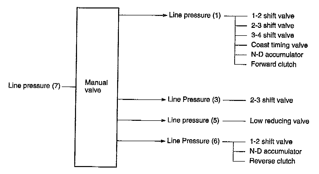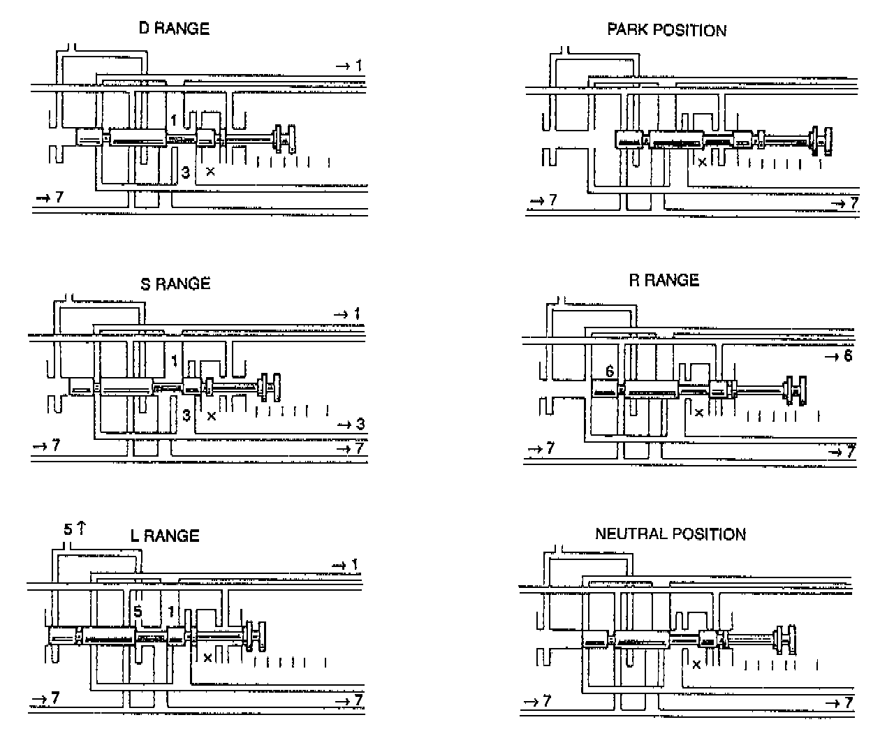 When the selector lever is moved, the manual valve moves also, until it is located in a position where line pressure (7) is distributed to each line pressure circuit for each P, R, N, D, S and L range. Line pressures (1), (3), (5), and (6) are distributed to each valve. When line pressure (7) is not in a distribution position the line pressures (1), (3), (5) and (6) are drained at the X position.
