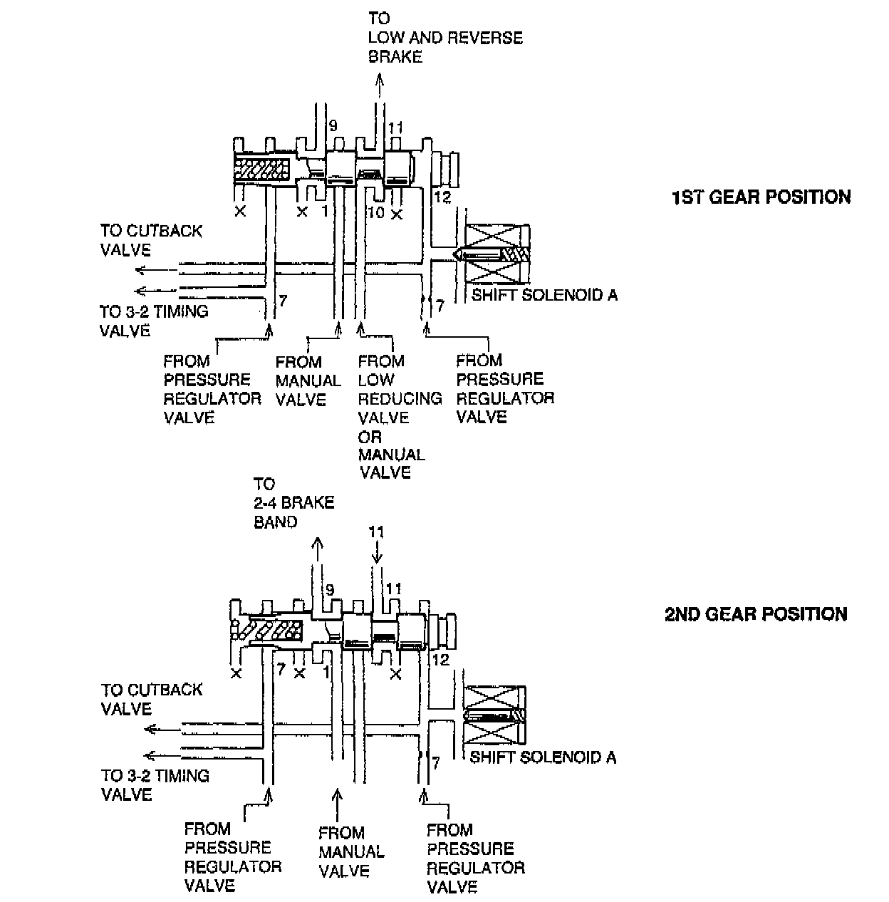 With the shift solenoid A OFF, line pressure (12) becomes equal to line pressure (7), and pushes the valve to the left side, shifting to 1st gear. When vehicle speed becomes high, the transmission control module turns ON the shift solenoid A and line pressure (12) is drained from the shift solenoid A. Consequently, spring force and line pressure (7) working on the left end of the valve push the valve to the right, shifting to 2nd gear. Even when line pressure (12) is drained, line pressure (7) does not change, due to there being an orifice. In 2nd gear, line pressure (1) is transmitted to (9), engaging the 2-4 brake band with a slow pressure increase by the 1-2 accumulator operation. Also, in L range, low reducing pressure (10) is transmitted to (11) in 1st gear, engaging the low and reverse brake. In 2nd gear, (11) is drained, releasing the low and reverse brake.