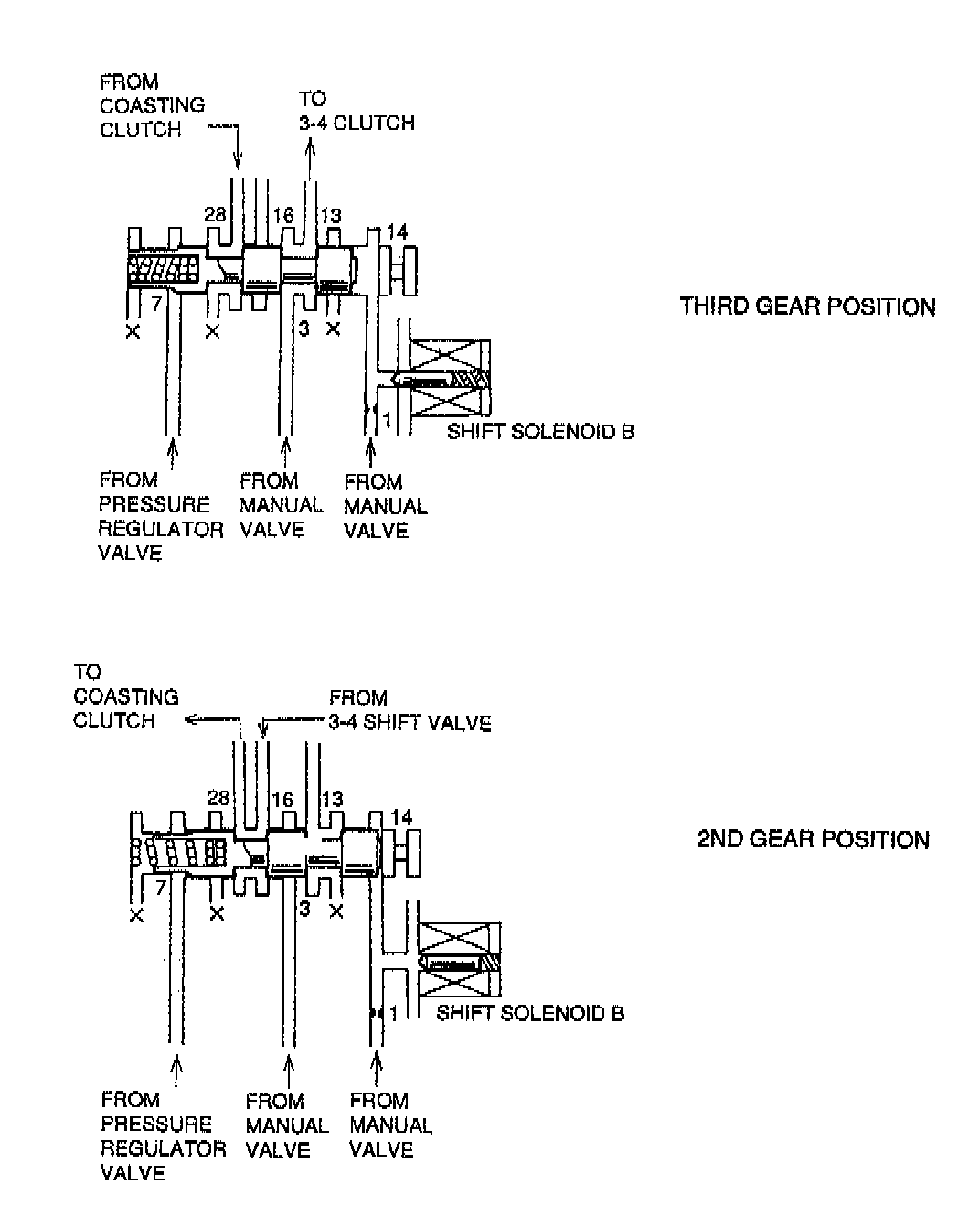 In S and L ranges, line pressure (16) from the 3-4 shift valve is transmitted to (28), applying the coasting clutch. When vehicle speed becomes high, the transmission control module turns OFF the shift solenoid B. As a result, line pressure (14) becomes equal to line pressure (1) and surpasses the combination of spring force and line pressure (7). This forces the valve to move to the left, shifting to third gear.