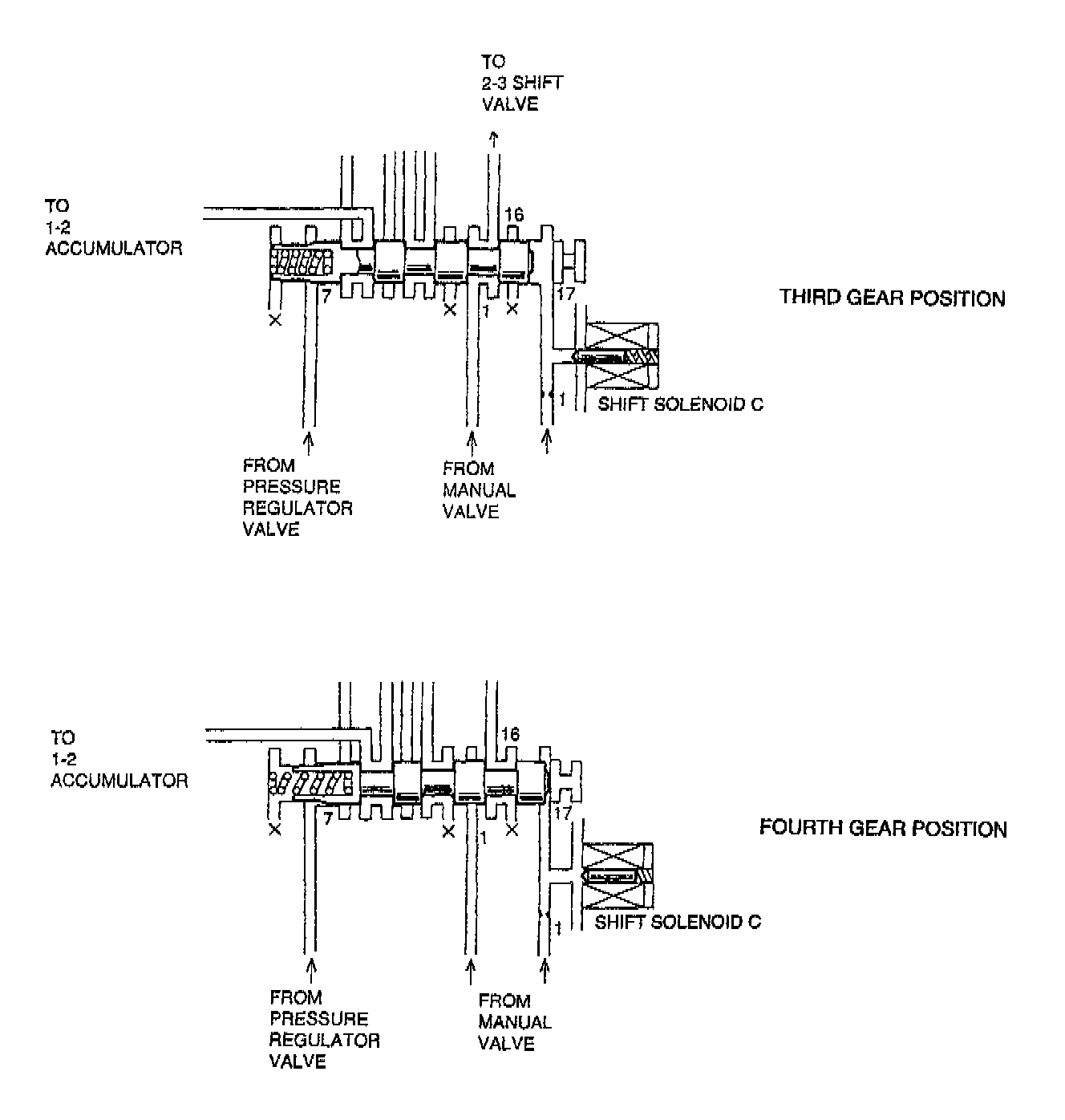 With the valve in third gear, line pressure (1) joins line pressure (16), engaging the coasting clutch through the 2-3 shift valve. When vehicle speed becomes high, the transmission control module turns ON the shift solenoid C, allowing line pressure (17) to be drained from the shift solenoid C. Consequently, the combination of spring force and line pressure (7) push the valve to the right side, shifting to fourth. In gear position, (15) is drained, releasing coasting clutch and engaging the 2-4 brake band.