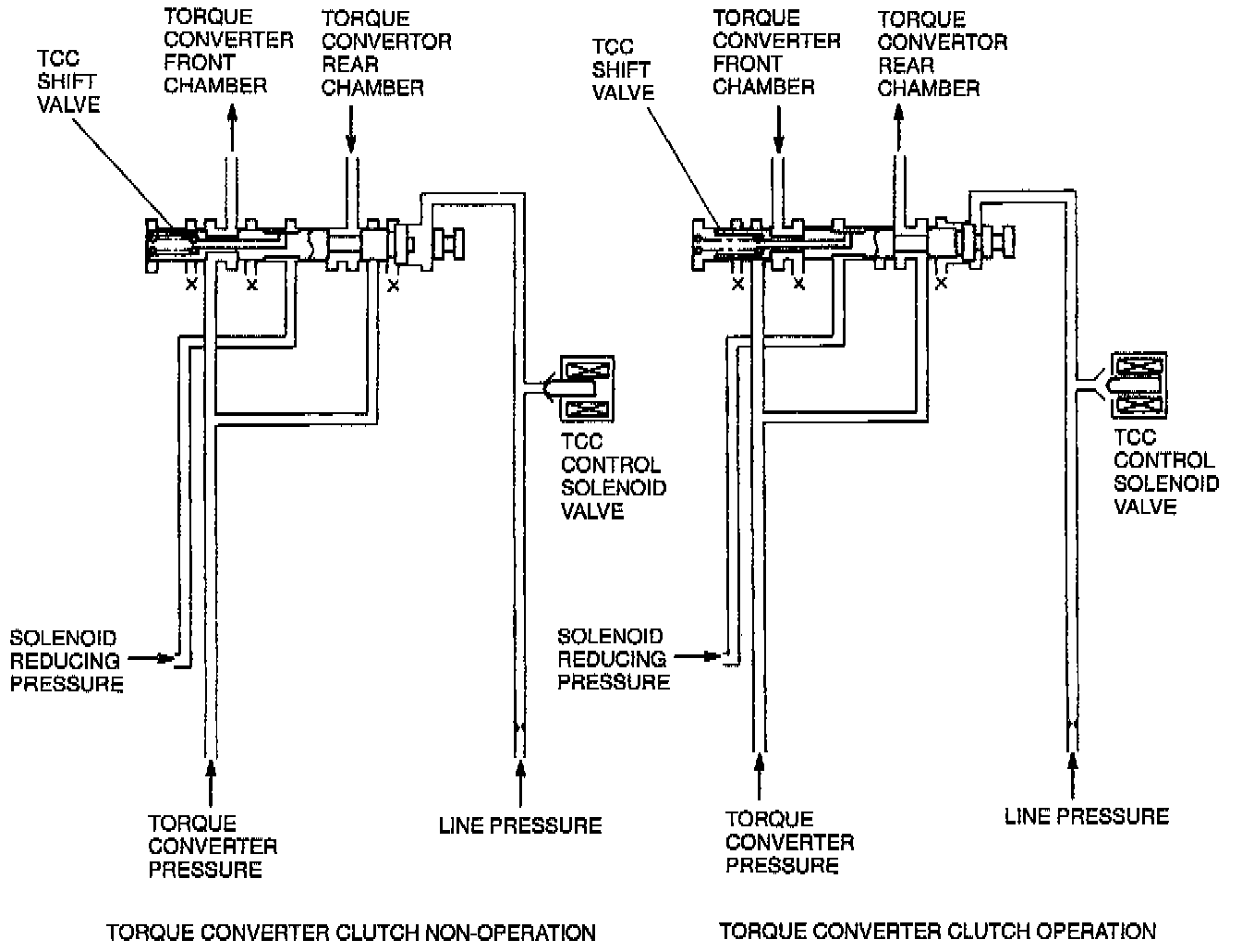 With the torque converter clutch control solenoid valve ON, line pressure is drained through the torque converter clutch control solenoid valve; the torque converter clutch shift solenoid valve moves to the right side due to the spring force. consequently, the hydraulic pressure applied to the torque converter front chamber is drained through the torque converter clutch control valve, engaging torque converter clutch.