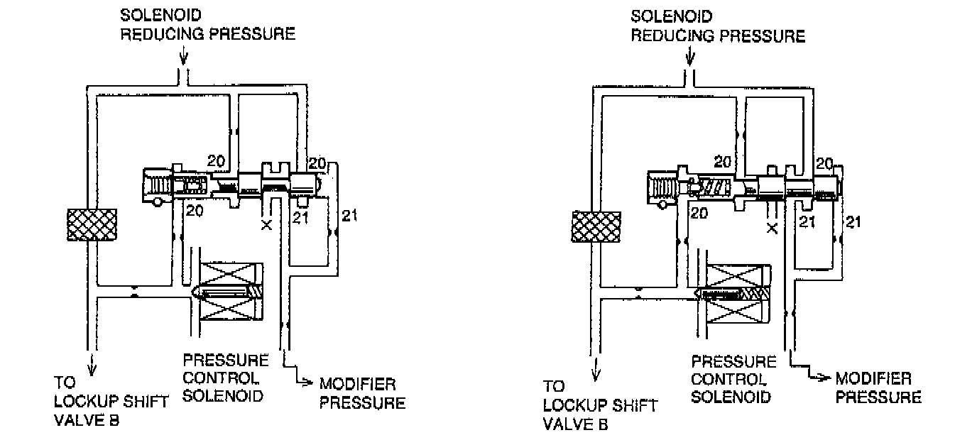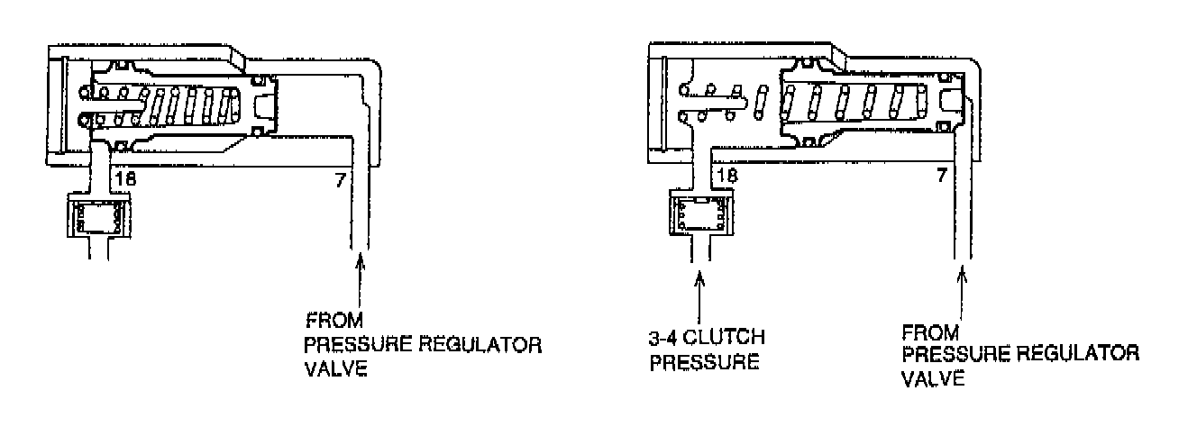 Spring force and modifier pressure (21) normally push the valve to the right side, thus transmitting line pressure (13) to 3-4 clutch application pressure (18), 3-4 clutch application pressure (18) works on the right end of the valve, and moves the valve to the left side.