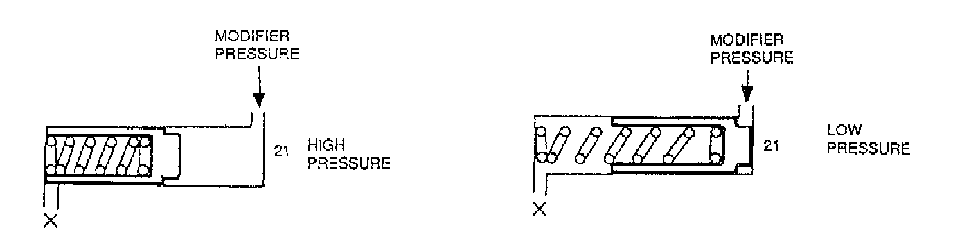As a result, the pressure regulator valve balances at the point which the (A) chamber line pressure acting toward the left balances with the spring force and modifier pressure (21) acting toward the right force.