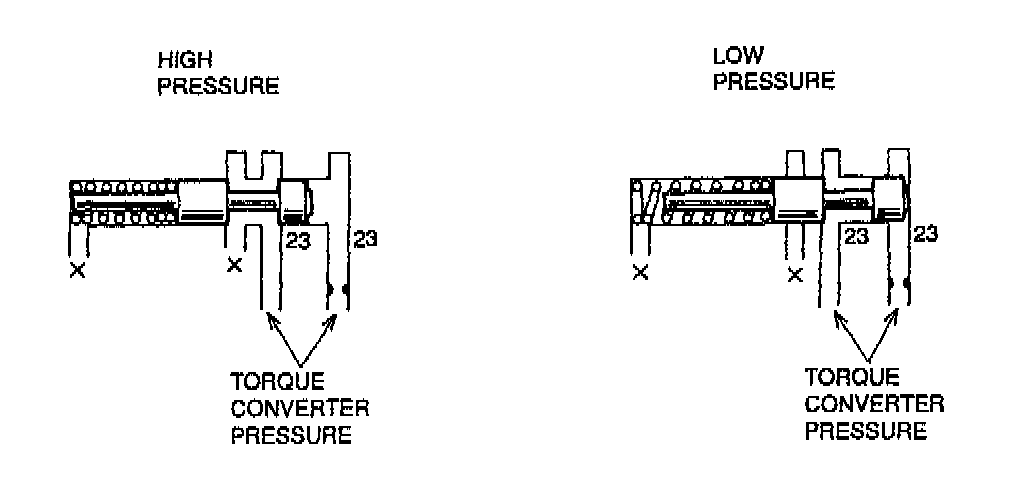 Torque converter pressure (23) generated by the pressure regulator valve is constantly applied to the right end of the converter relief valve. Spring force, however, moves the valve to the right side. When torque converter pressure (23) increases, it overcomes spring force and pushes the converter relief valve to the left side. The pressure (23) is drained and maintained under a specified level.