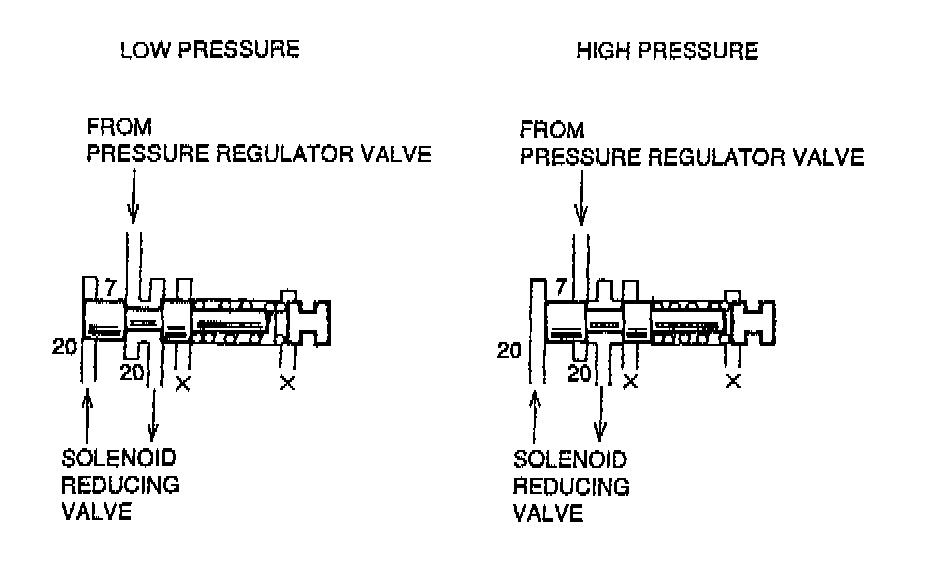 Solenoid reducing pressure (20) pushes an the solenoid reducing valve to the right, while spring force pushes to the left. When solenoid reducing pressure (20) increases, the solenoid reducing valve moves to the right until pressure is drained. This maintains a constant pressure to keep the spring force and line pressure (7) balanced. Solenoid reducing pressure becomes fixed.