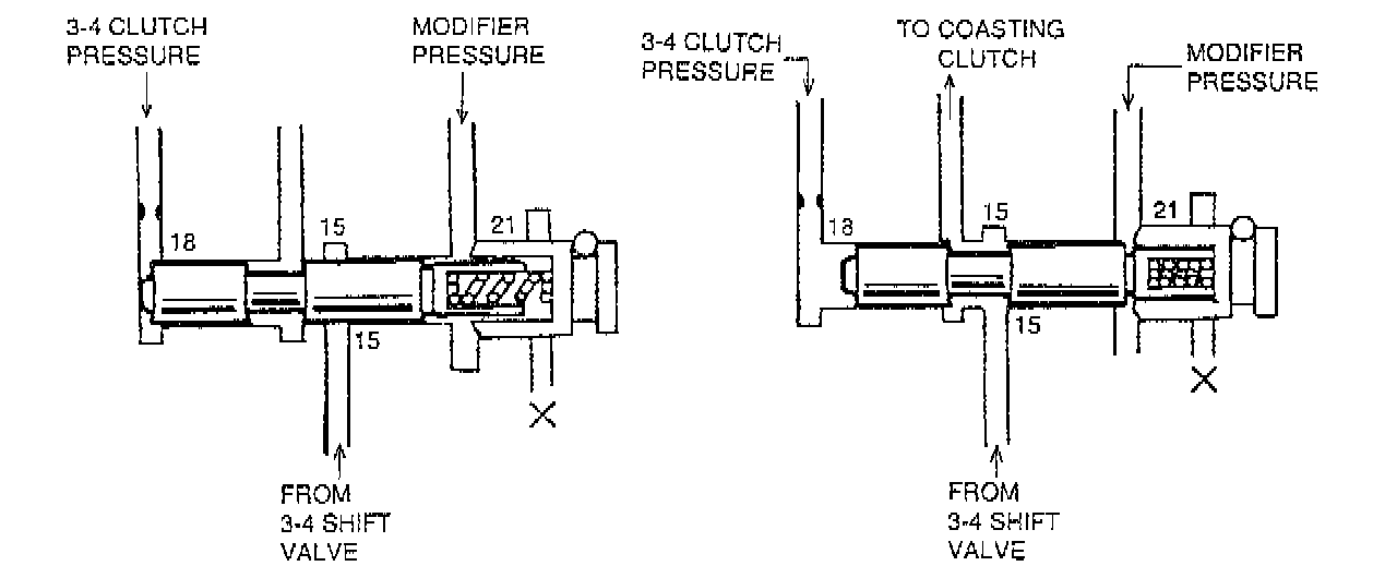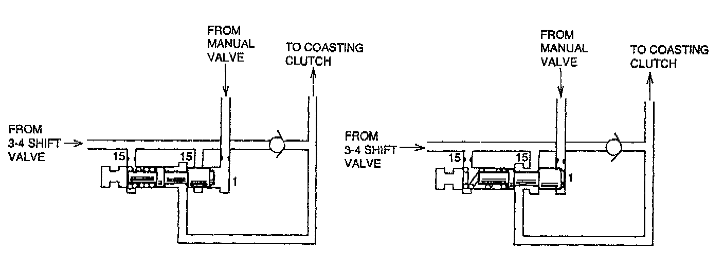 When the throttle valve opening angle is small, low 3-4 clutch application pressure (18) pushes the valve to the right, causing 2-4 brake release pressure (15) to pass through the valve and to work on the coasting clutch.