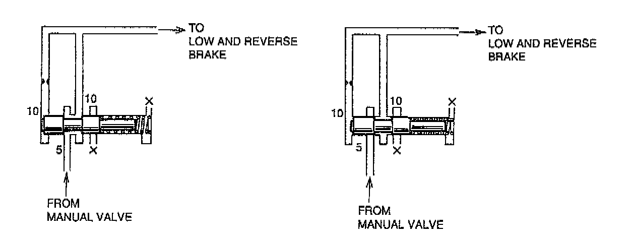 The valve is normally pushed to the left side by spring force. When L range is selected, line pressure (5) is transmitted to low reducing pressure (10).