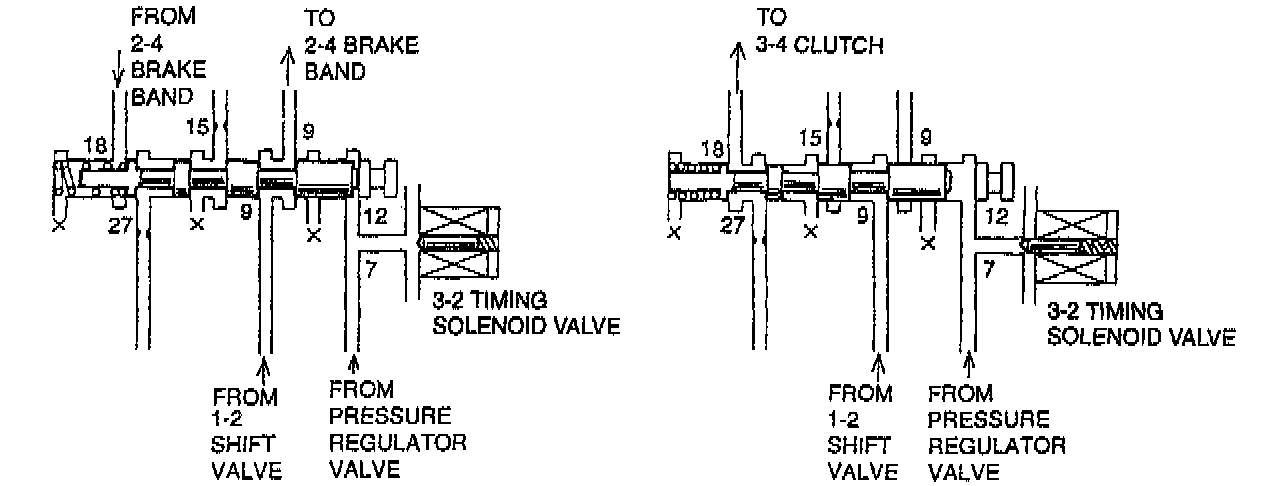 When shifting from third gear to 2nd, the 3-2 timing valve drains 2-4 brake release pressure (15) to achieve shifting timing. When 2-4 brake band application side pressure reaches the specified pressure, the 3-2 timing solenoid valve goes OFF, and the 3-2 timing valve moves to the left to close outlet port (9).