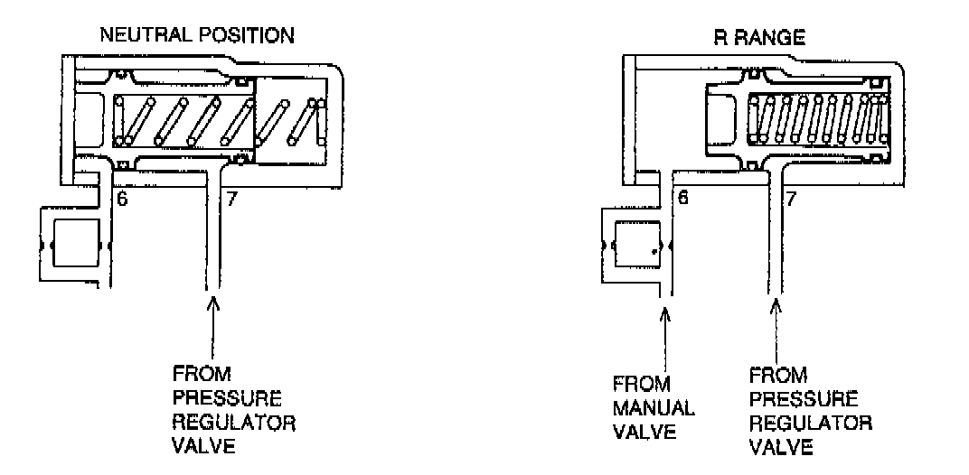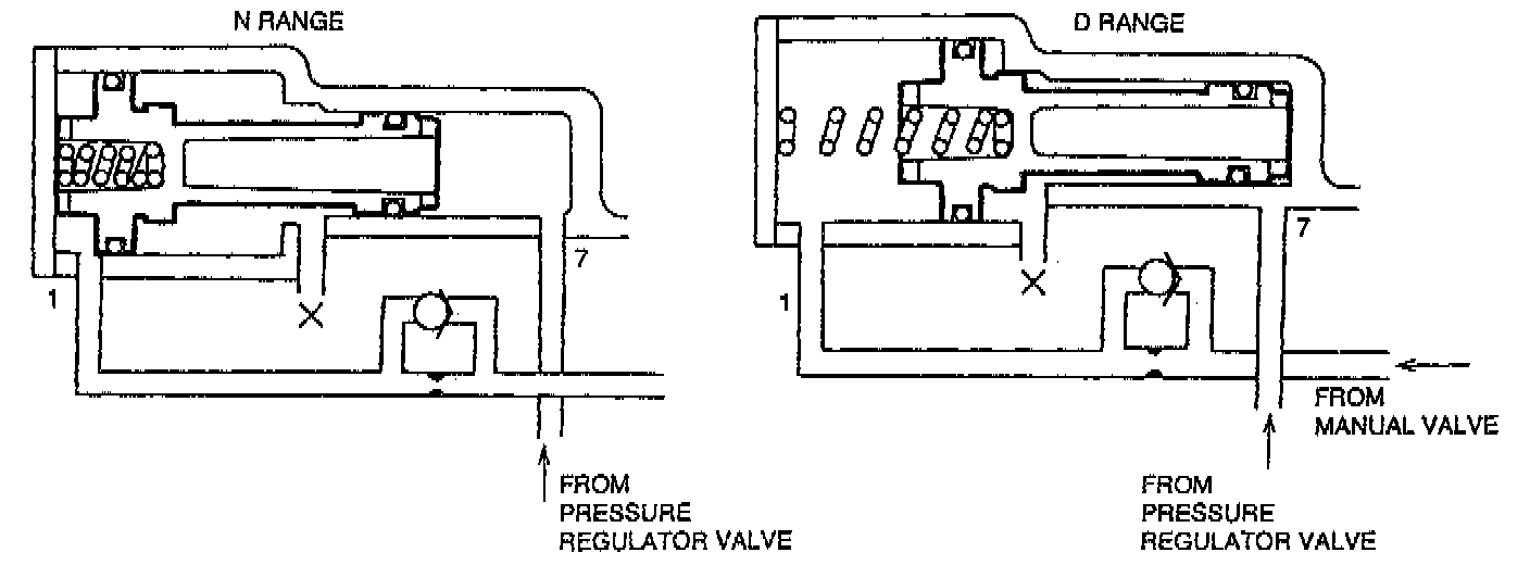 Line pressure (1), distributed by the manual valve, constantly works on the right end of the valve and moves the valve to the left side by overcoming spring force.