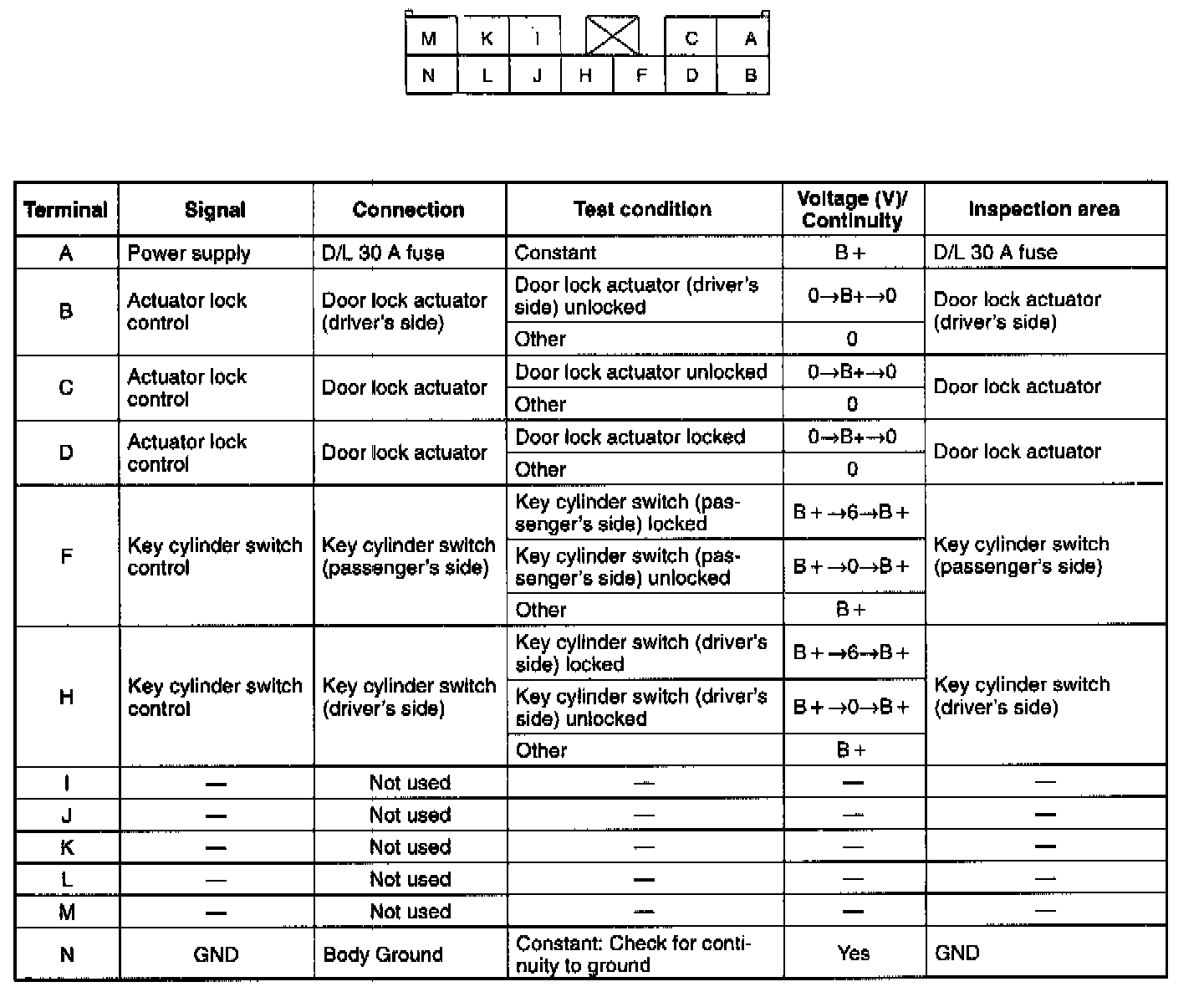 3. Disconnect the door lock timer unit connector before checking for continuity at terminal N.