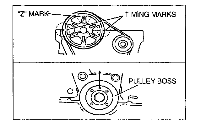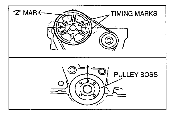 ^ Face "Z" mark on the camshaft pulley straight up and align the timing marks with the cylinder head upper surface.