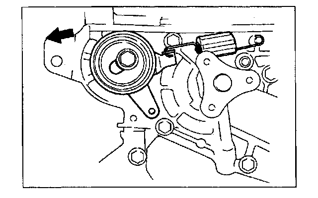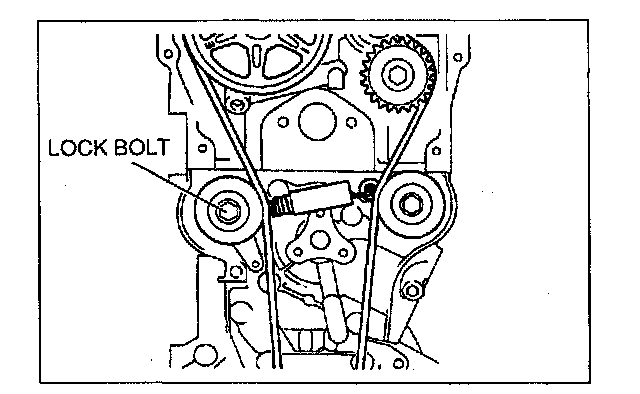 2. Loosen the tensioner lock bolt to apply tension to the timing belt. Do not apply tension other than that of the tensioner spring.