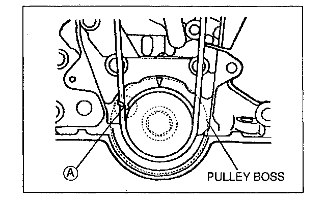 1. Install the pulley boss and pulley lock bolt. Turn the crankshaft clockwise 1 and 5/6 times, and verify that the timing mark and the tensioner set mark (A) are aligned.