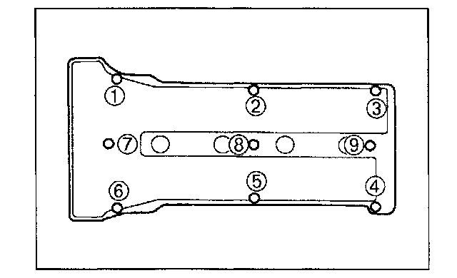6. Tighten the cylinder head cover bolts in five or six steps in the order shown.