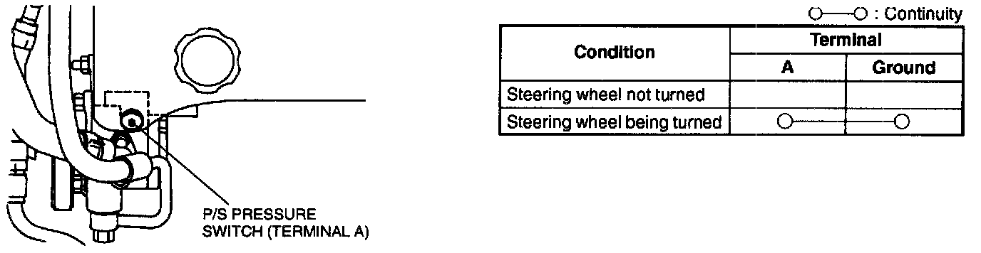 3. Check for continuity between power steering pressure switch terminal and a ground by using an ohmmeter.