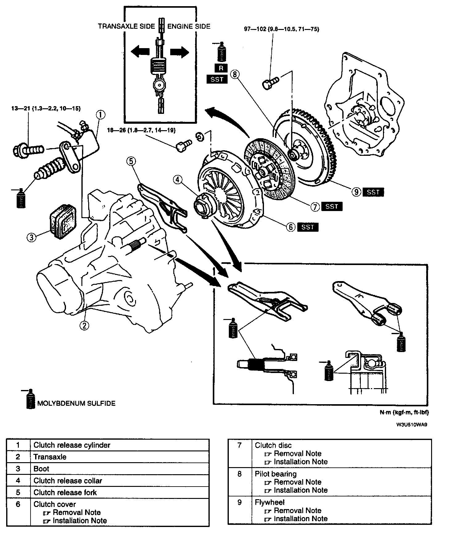 Tightening torque 97 - 102 Nm (9.8 - 10.5 kgf-m, 71 - 75 ft.lbs.)