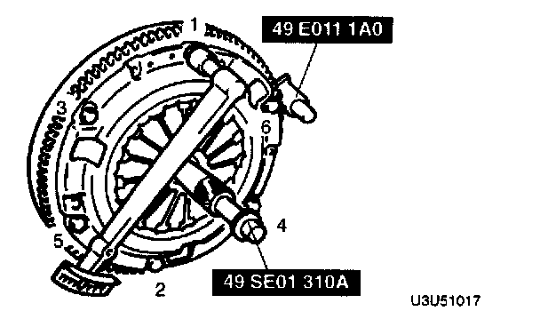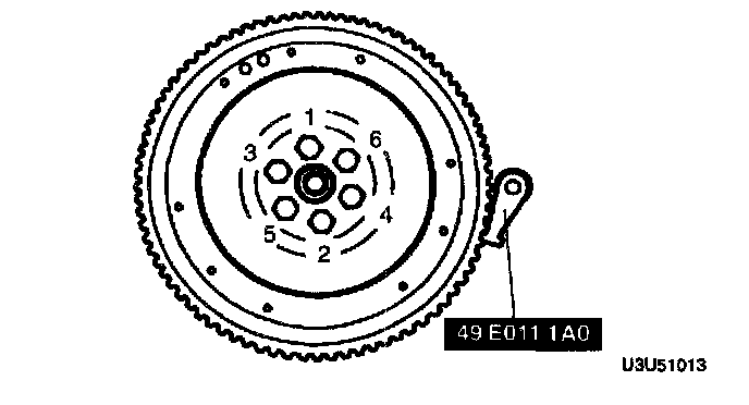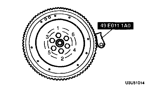4. Tighten the flywheel installation bolts in the pattern shown.