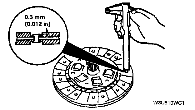 4. Using vernier calipers, measure the thickness of the lining at a rivet head on both sides. Replace the clutch disc if its thickness is less than minimum.