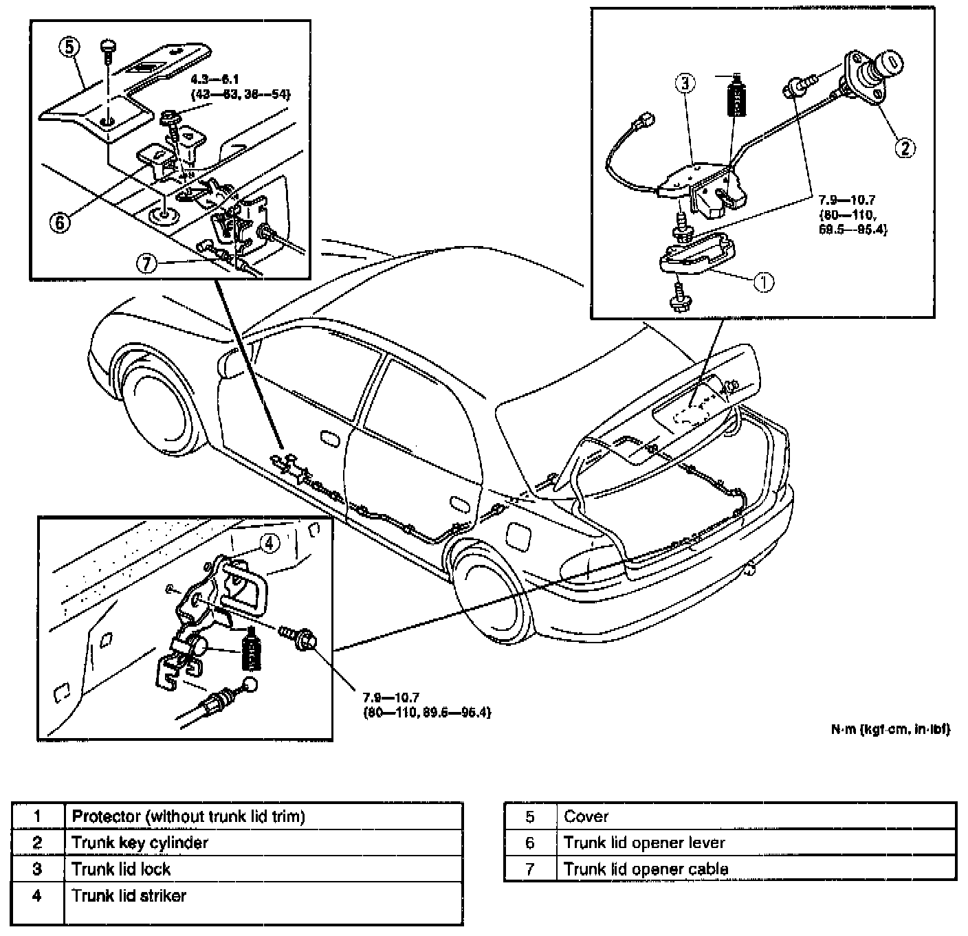 4. To remove the trunk lid opener cable, remove the right trunk side trim, rear seat back, left front scuff plate, and left rear scuff plate, and turn over the cabin carpet.