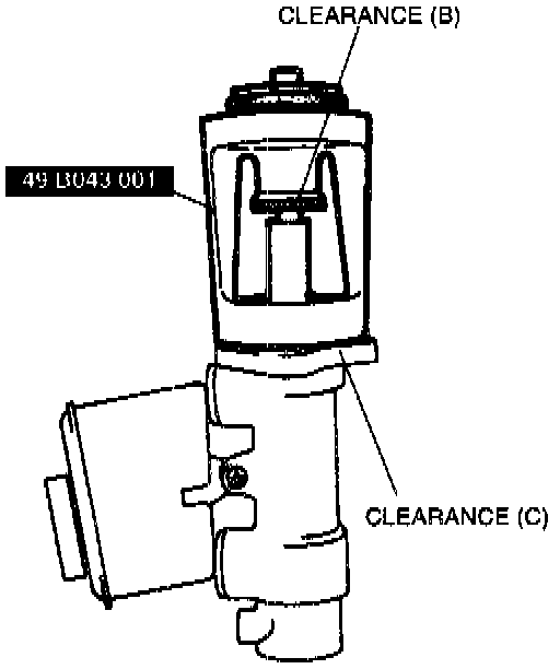 5. Push lightly on the end of the SST gauge rod to be sure it is bottomed in the master cylinder piston, but do not push so hard that the piston moves. Note any clearance between the SST body and the adjusting nut (clearance B) or between the body and the master cylinder (clearance C). Adjust the push rod as necessary as outlined in "Adjustment" below.