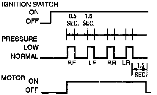 9. With the brake pedal still depressed, turn the ignition switch to ON and verify that the brake is released momentarily (approx. 0.5 sec.) and that the wheel turns when pressure-reduction operates.