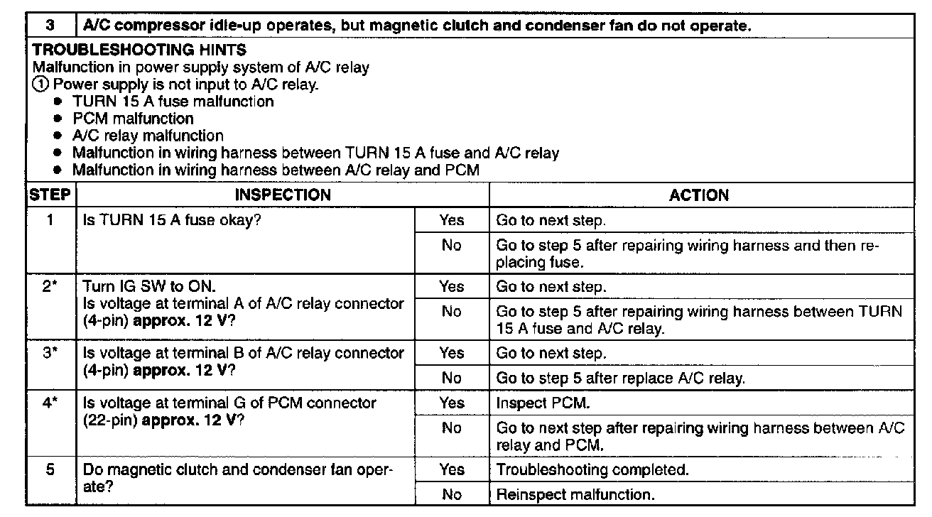 3. A/C Idle-Up Operates, Clutch and Condenser Fan Inop