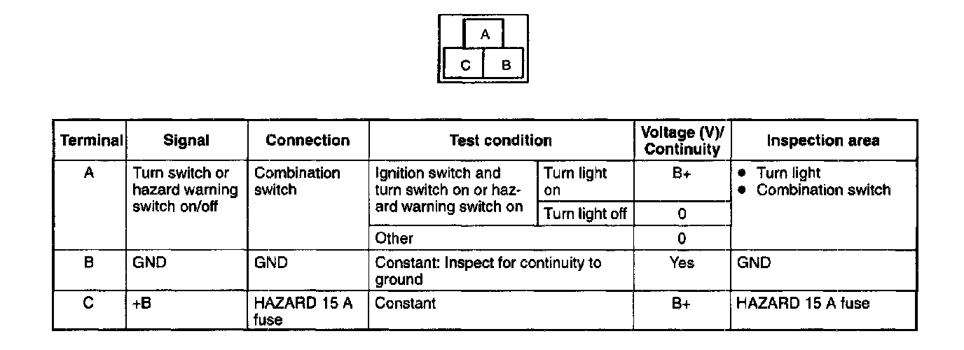 4. Disconnect the flasher unit connector before inspecting for continuity at terminal B.