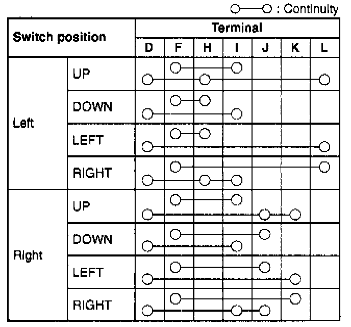 Inspect for continuity between the power outside mirror switch terminals by using an ohmmeter.
