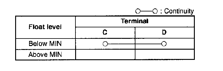 1. Disconnect the washer fluid-level sensor connector.2. Inspect for continuity between the washer fluid-level sensor terminals by using an ohmmeter.
