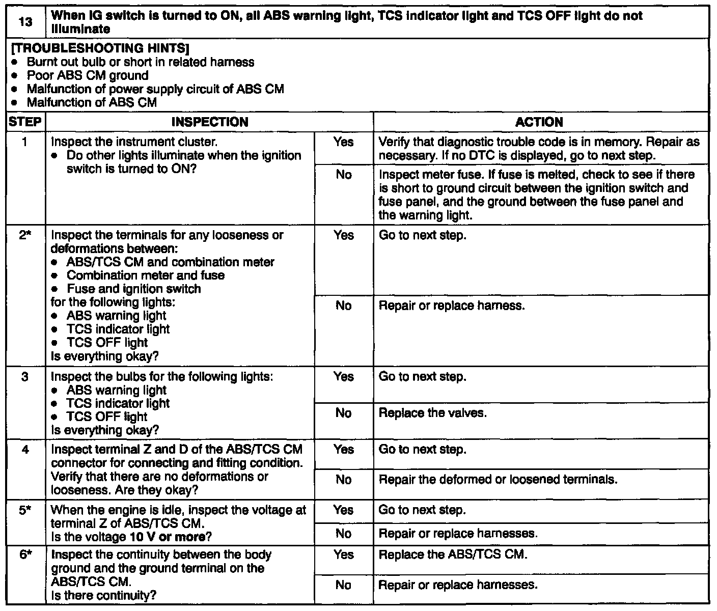 13. IG Switch Turned ON, ABS/TCS/TCS OFF Light Don't Illuminate