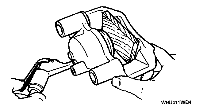 - Place a piece of wood in the caliper, then blow compressed air through the hole to force the piston out of the caliper.