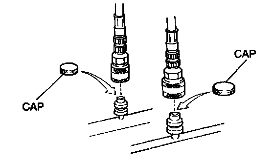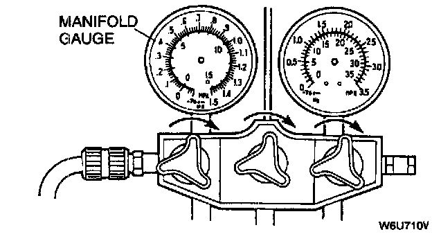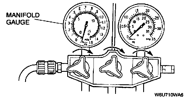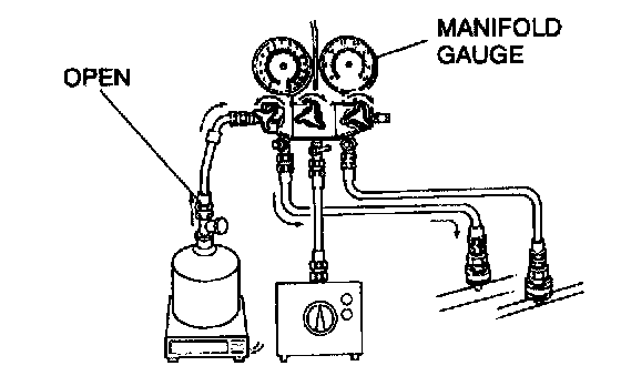 CAUTION: Close the manifold gauge valve immediately after stopping the vacuum pump. If the valve is left open, the vacuum pump oil will backflow Into the refrigeration cycle and cause a decrease in the efficiency of the air conditioner.