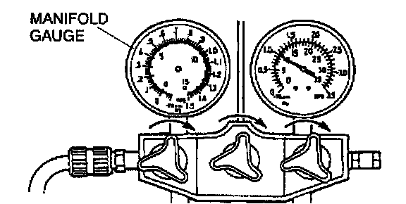 15. When the high-pressure side reading increases to 0.098 MPa (1.0 kg/sq.cm, 14psi), close the low-pressure side valve of the manifold gauge.