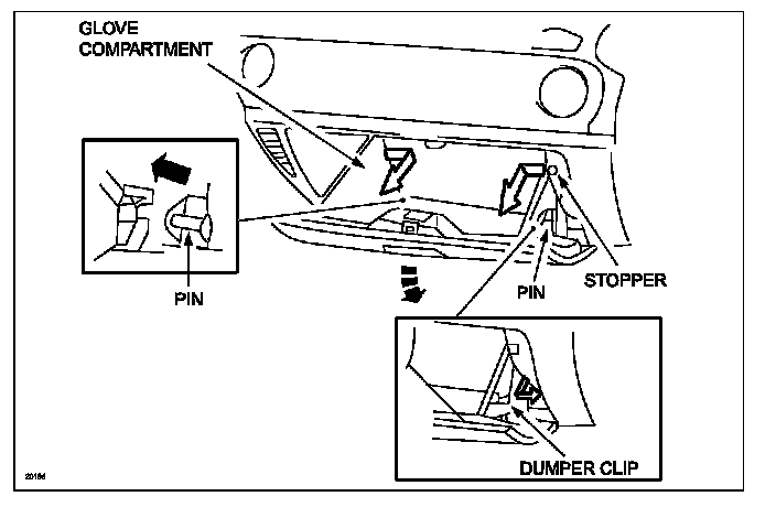 C. Turn the glove compartment downward and pull the pins.