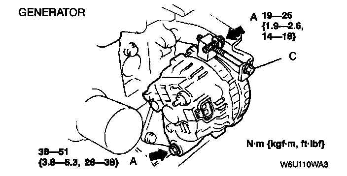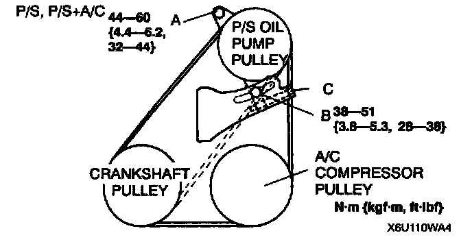 Adjust the belt deflection or tension by turning the adjusting bolt C.