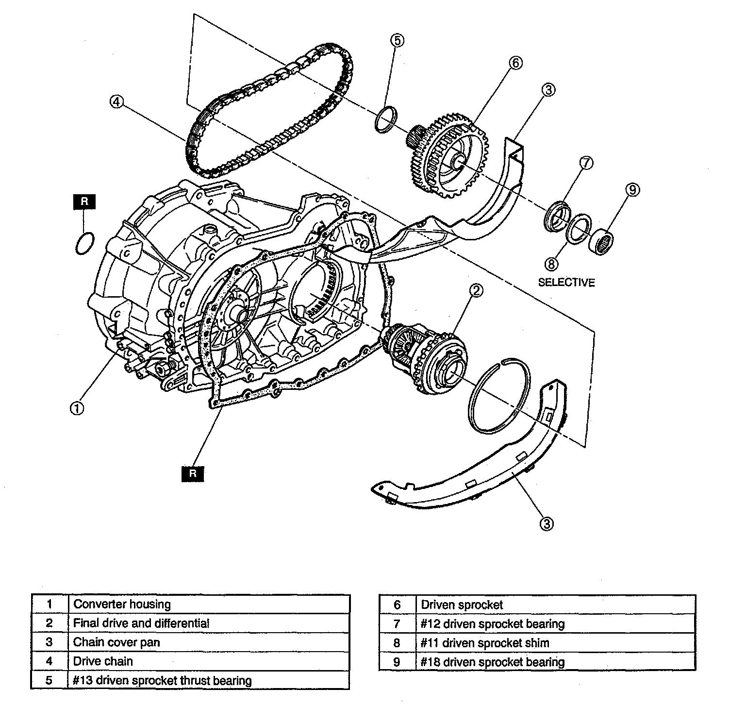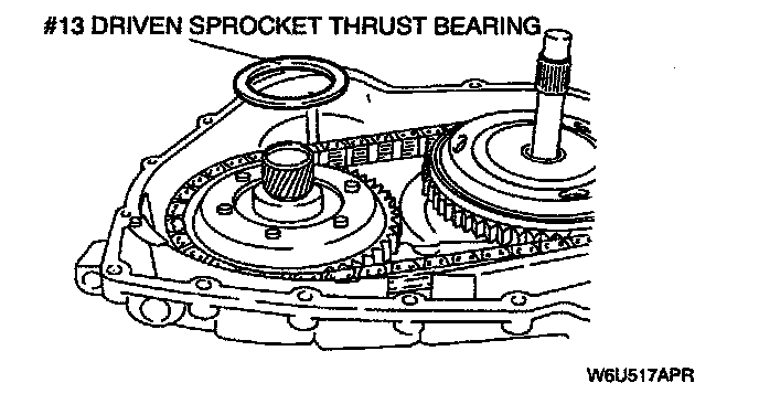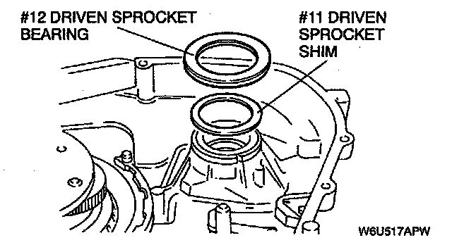 49. Remove the # 12 driven sprocket bearing and the # 11 driven sprocket shim (selective fit) from the transaxle case.