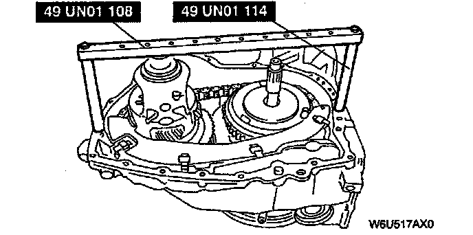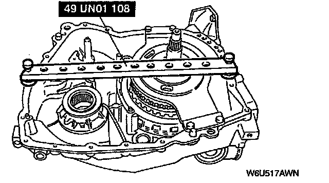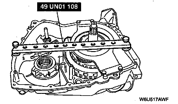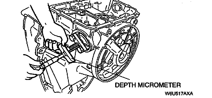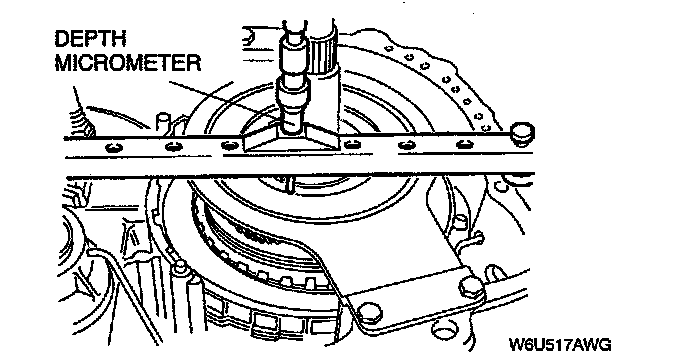 64. Use a depth micrometer to measure the distance from the top of the gauge bar to the bearing surface on the reverse/fourth gear carrier. Repeat this measurement on the other side of the turbine shaft. Average the two measurements. This is dimension A.