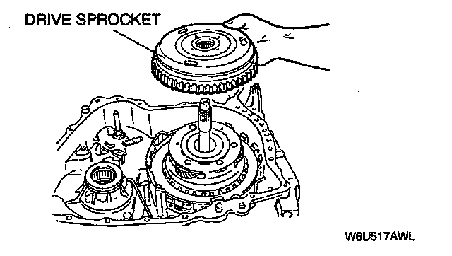 86. Lower the chain drive and its sprockets together in the transaxle case. Verify that both sprockets are seated.