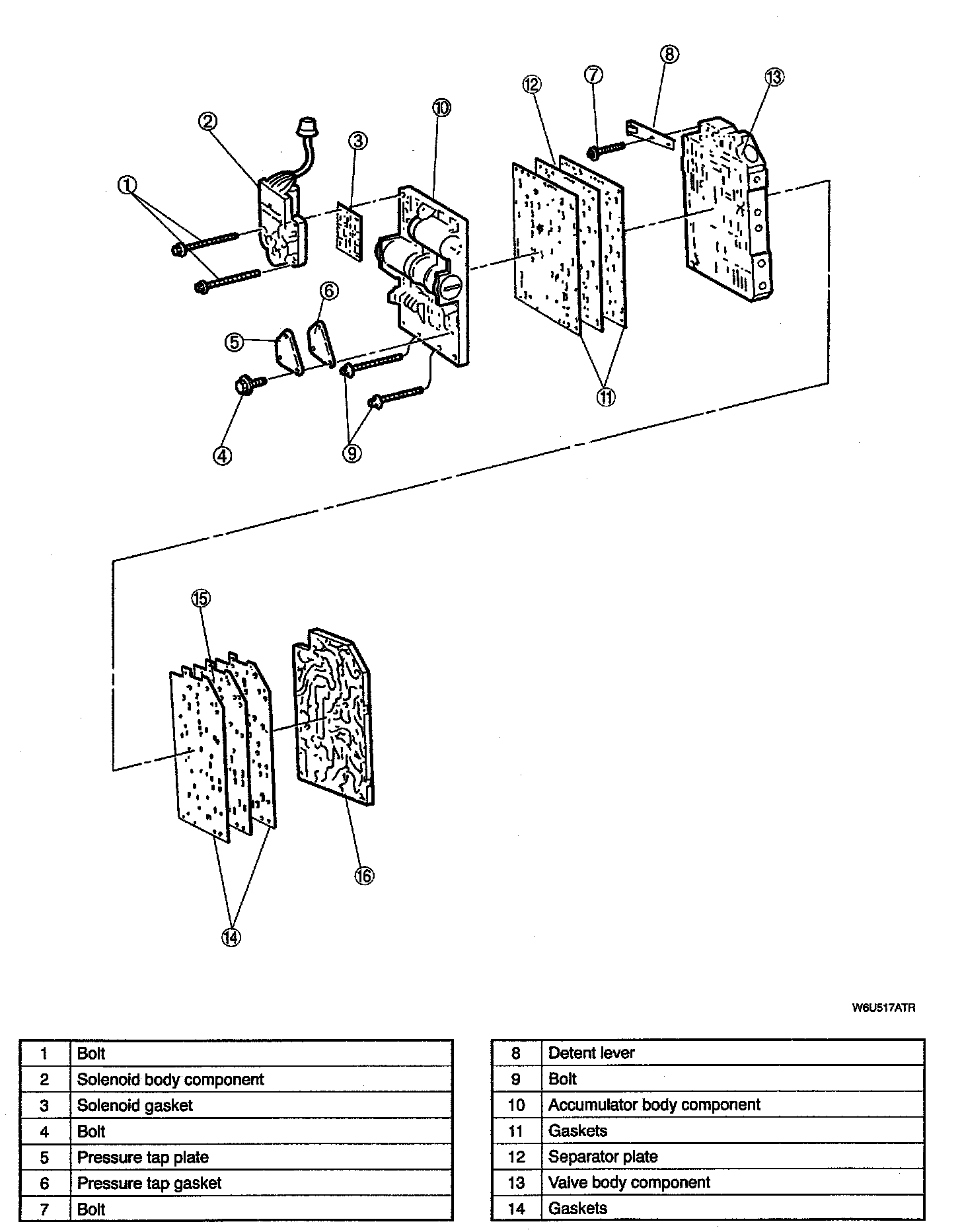 7. Remove the accumulator body, separator plate, and gaskets from the valve body component. Discard the gaskets.