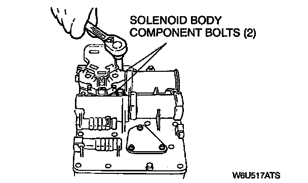 1. Remove manual control valve from the valve body. Remove the two solenoid body component bolts. Remove the solenoid body component.