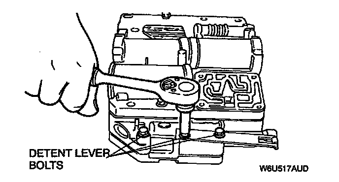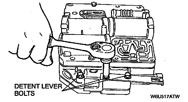 5. Remove the three valve body-to-transfer plate bolts. Remove the detent lever.