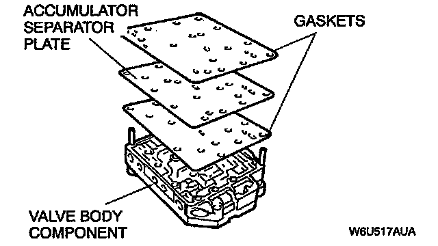 4. Install the accumulator body separator plate and new gaskets on the valve body component.