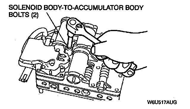 10. Install the two solenoid body-to-accumulator body bolts.