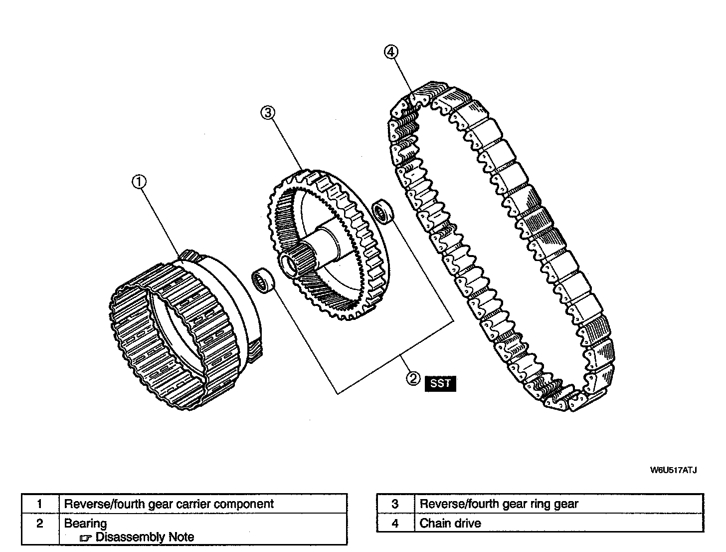 REVERSE/FOURTH GEAR RING GEAR, REVERSE/FOURTH GEAR CARRIER COMPONENT, AND CHAINDRIVE DISASSEMBLY/ASSEMBLY1. Disassemble in the order indicated in the table.