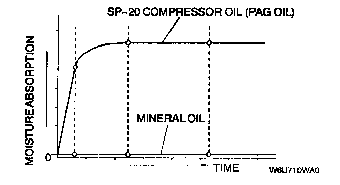 - SP-20 compressor oil (PAG oil) has a higher moisture absorption efficiency than the previously used mineral oil. If moisture mixes with the compressor oil, the refrigerant system could be damaged. Therefore, install caps immediately after using the compressor oil or removing refrigerant system parts to prevent moisture absorption.