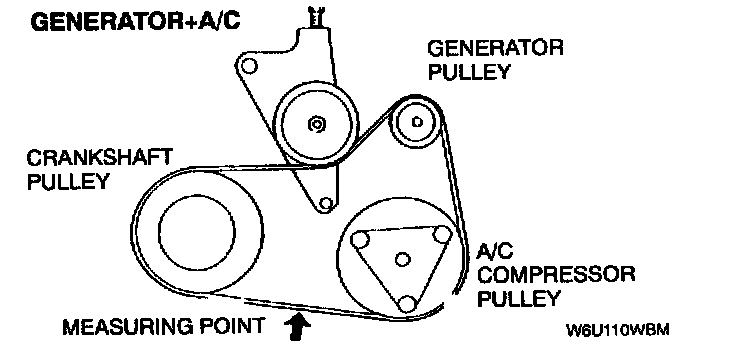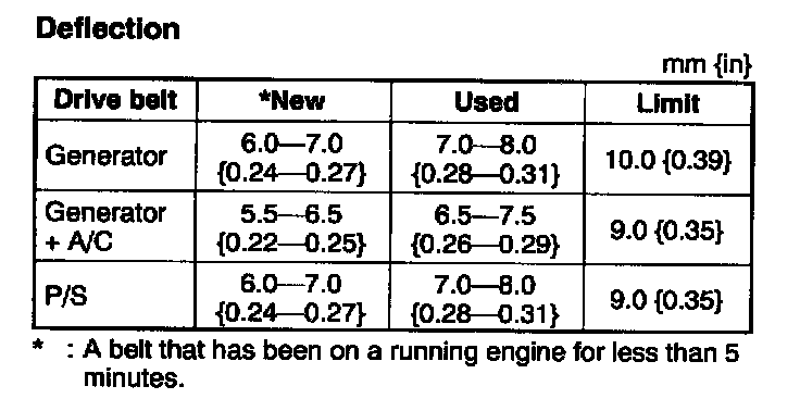 1. Verify the drive belt deflection when the engine is cold, or at least 30 minutes after the engine has stopped. Apply moderate pressure 98 N (10 kgf, 22 lbs. midway between the specified pulleys. If the deflection is not within the specification, adjust it.
