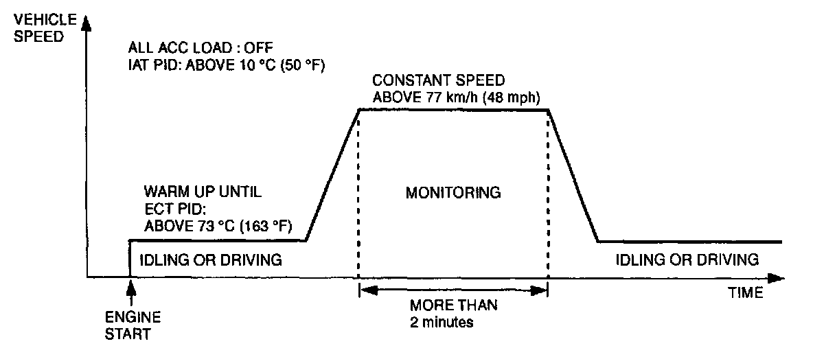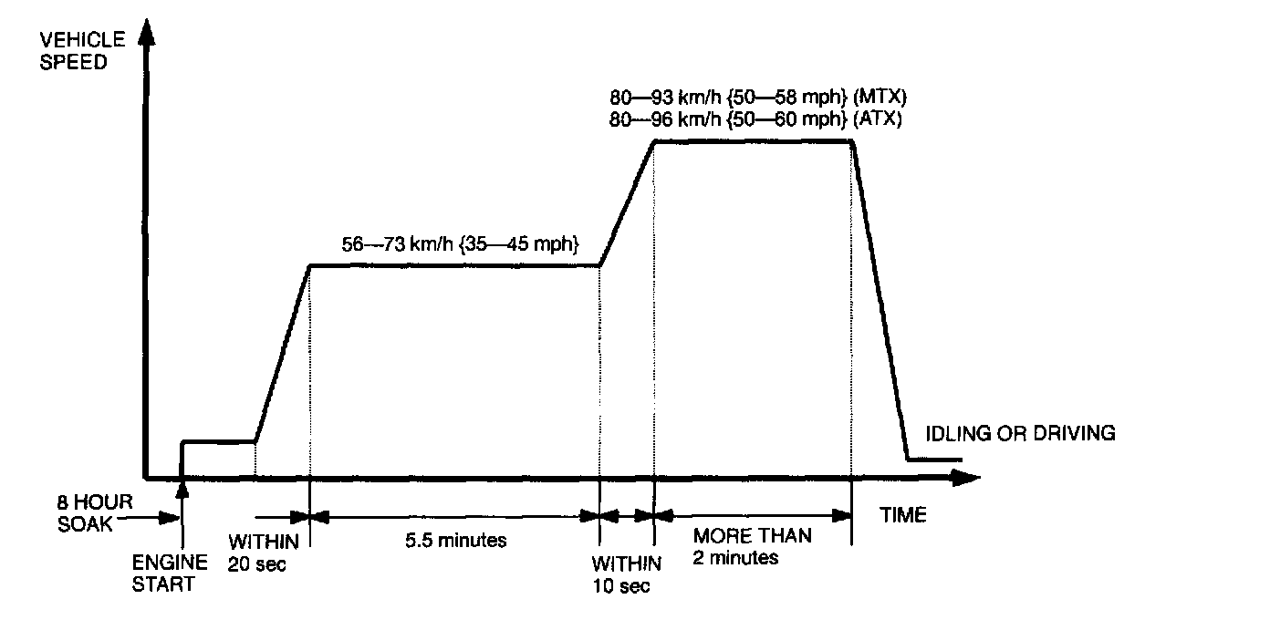7. Accelerate to 80 - 96 kph (50 - 60 mph) (ATX), 80 - 93 Kph (50 - 58 mph) (MTX) within 10 seconds and drive vehicle for at least 2 minutes.