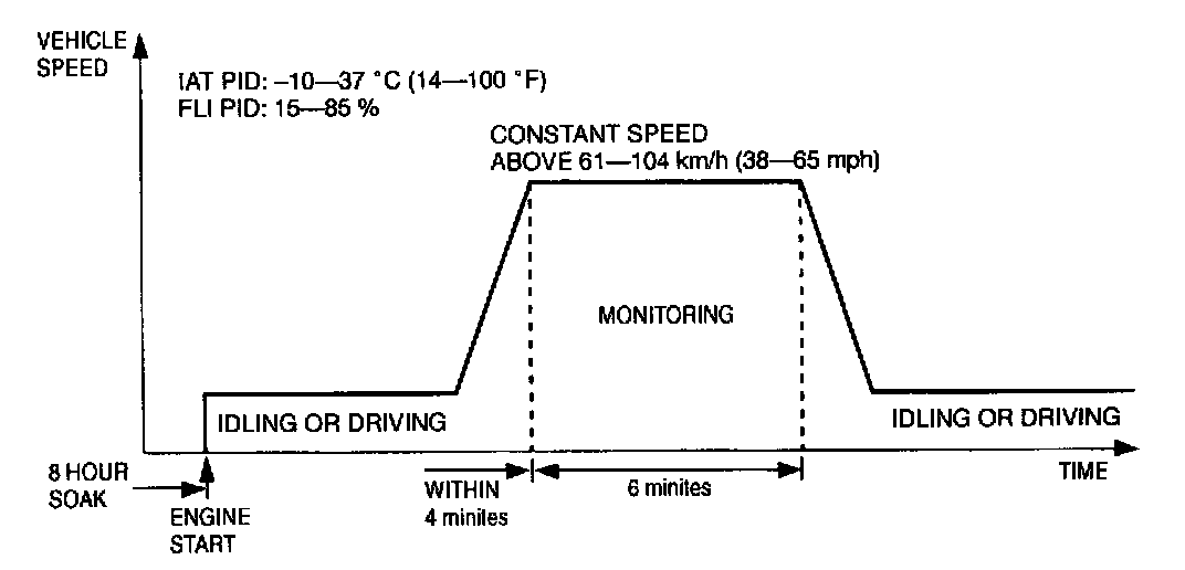 NOTE: The cold soak period can be shorten up to 3 hours depending on vehicle conditions when the 8-hour-timer bypass procedure is performed. If you shorten the soak period, the PCM may detect malfunction by mistake even though the EVAP system has been repaired correctly. This misdiagnosis will happen more often under warm or hot ambient temperature. If you are not sure whether the system still have malfunction, soak 8 hours and perform the drive mode again. If malfunction is not detected, the repair is completed.