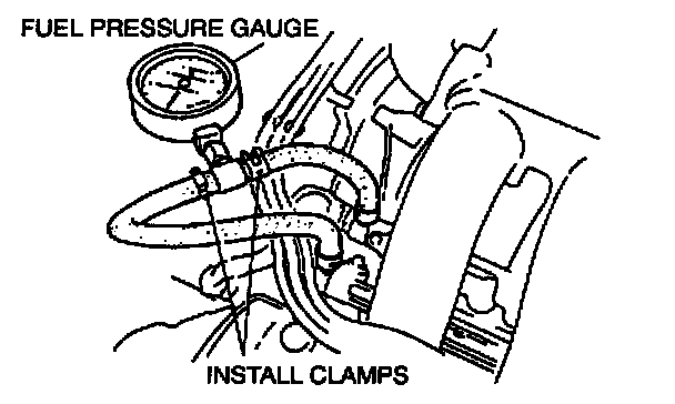 3. Connect a fuel pressure gauge between the fuel distributors RH and LH as shown. (Install clamps as shown).