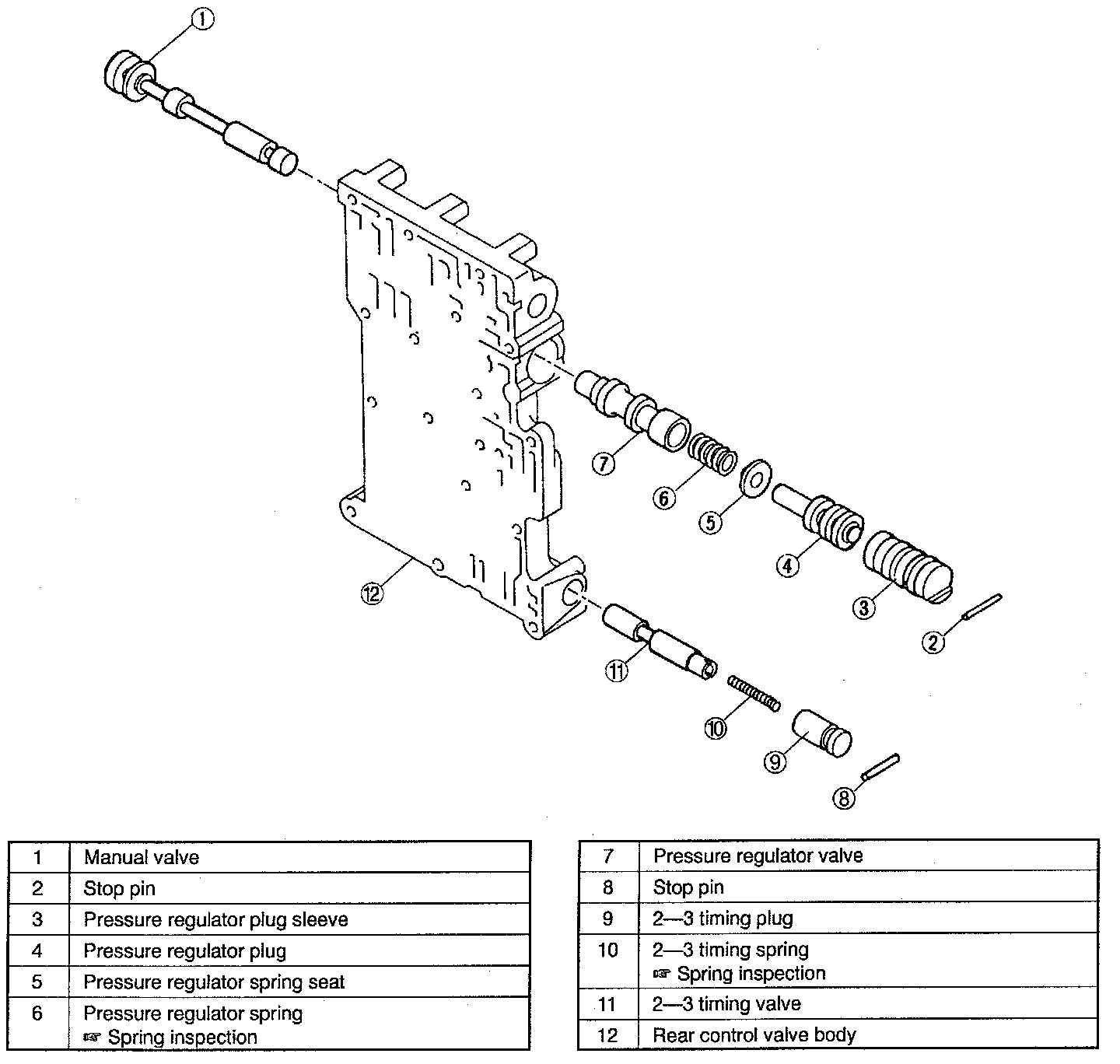 REAR CONTROL VALVE BODY DISASSEMBLY / INSPECTION / ASSEMBLYCAUTION: Denting or scratching these precisely machined components will reduce the ability of the transaxle to shift properly. When handling these components or the valve body that contains them, be careful not to drop or hit them.